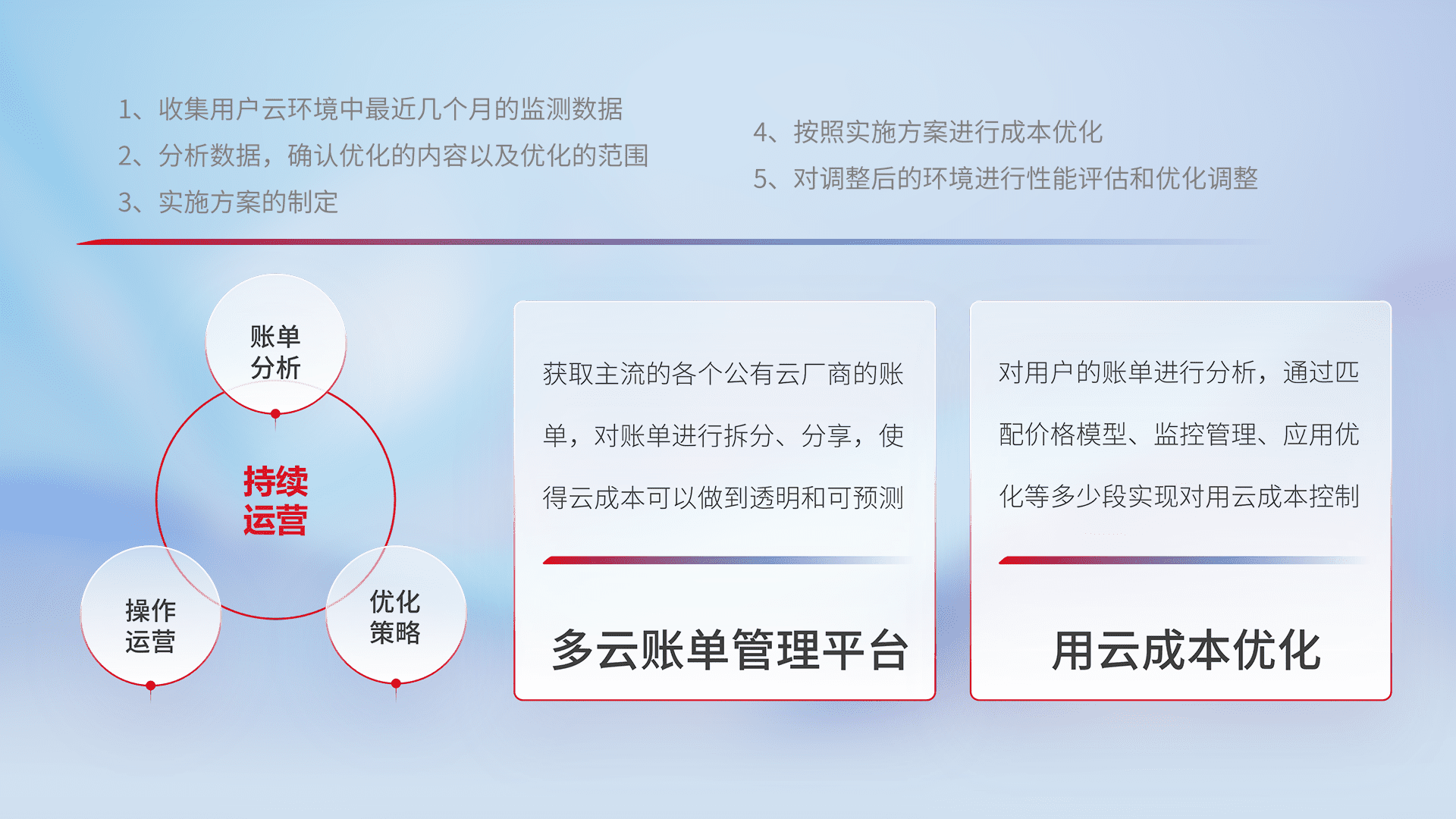 通过多云纳管,,以统一的资源数据模型把客户的云资源进行抽象和封装,,进而实现对多云资源的统一操作,,,保障云资源管理的可靠性、、稳定性与可用性。。。量身定制化运维内容,,配置、、、开发运维、、补丁管理、、备份、、、、监控、、、、认证和访问管理、、、、审计和日常巡检等,,保障在用云过程中的可靠度,,,稳定度以及高可用率。。